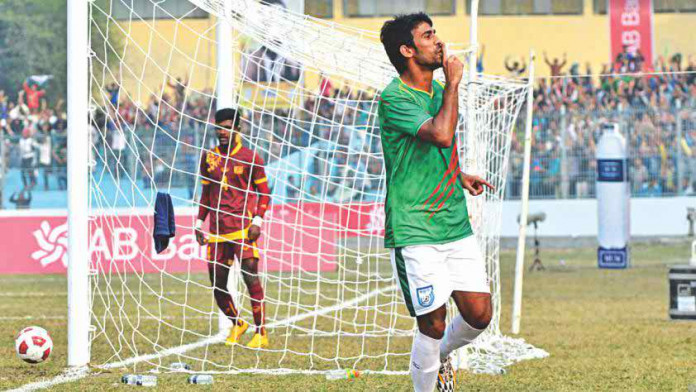 Bangladesh took back the lead a minute later from a header by Yeasin Khan and just before half time made it 3-1 with Nabib Jibon scoring from close range.