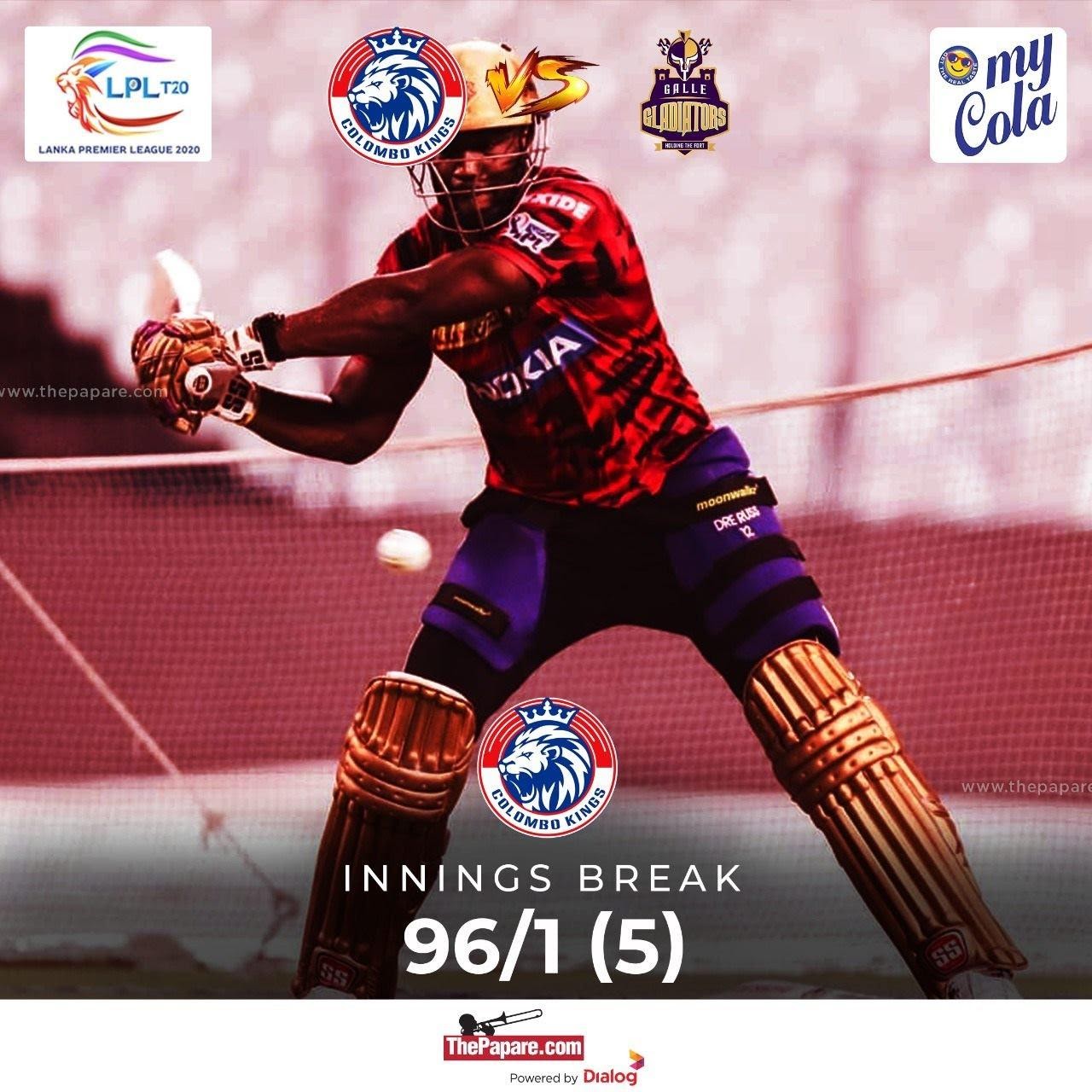පන්දුවාර 5 පුරාවටම කඩුල්ලේ රැඳී සිටිමින් ක්රීඩා කළ Russell 4 පහර 9ක් සහ 6 පහර 4ක් සමඟ පන්දු 19ක දී නොදැවී ලකුණු 65*ක් ලබා ගත්තේ Colombo Kings ලකුණු සටහන 96/1ක් දක්වා රැගෙන යමිනි.