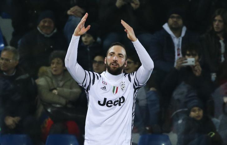 Gonzalo Higuain scored either side of halftime as Serie A leaders Juventus won 2-0 at Cagliari on Sunday to preserve their seven-point lead over second-placed AS Roma, who downed Crotone 2-0 away after goals from Radja Nainggolan and Edin Dzeko.