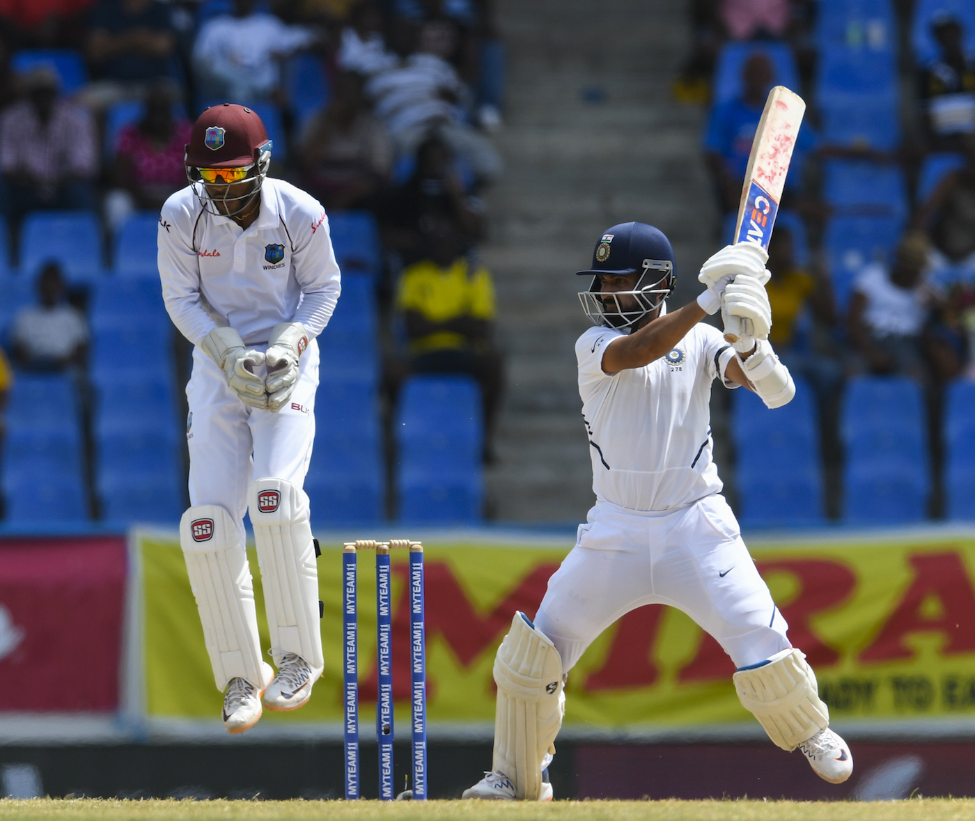 இந்தியா (இரண்டாம் இன்னிங்ஸ்) – 343/7 (112.3) அஜிங்கியா ரஹானே 102, ஹனுமா விஹாரி 93, விராட் கோலி 51, ரொஸ்டன் சேஸ் 132/4