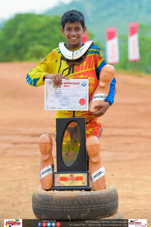 Under 13 & Under 16 National champion, 12 year old Dilitha Kalhara rode impressively and is blooming, to be a real challenger even in the big league in the coming years. The youngster clinched the first place in both races of the Group JMX – Over 79cc up to 85cc (2T) & 100cc up to 150cc 4T – Under 16. This ambitious young man did not stop there as he also competed in the Group MX – Over 100cc upto 125cc 2T Open event. Kalhara made everyone turn their heads and take notice as he went onto clinch the 3rd place coming behind vastly experienced and much older Lahiru Jeewantha and Mithun Sigera.