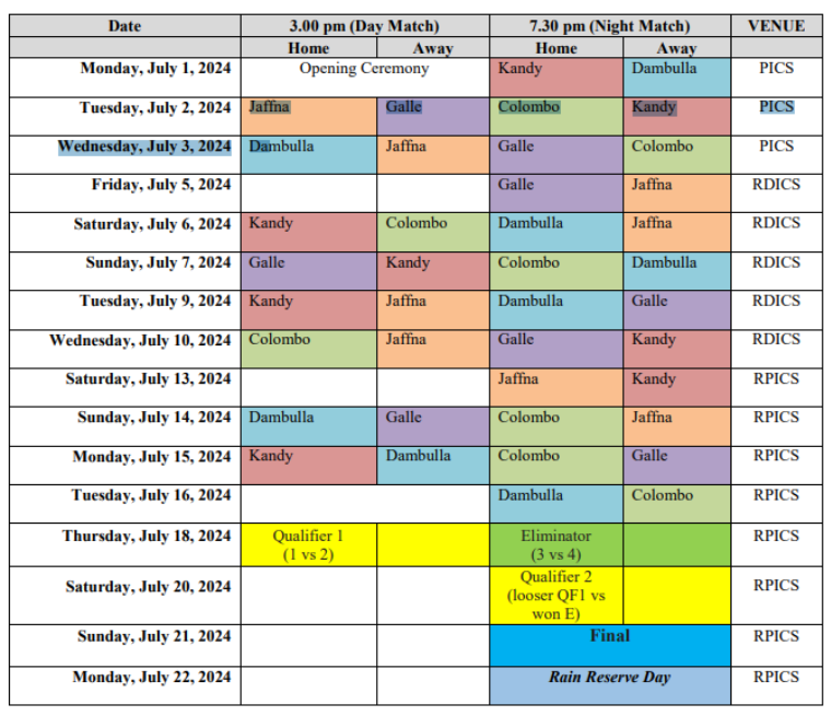 இலங்கையில் எதிர்வரும் ஜூலை மாதம் ஆரம்பமாகவுள்ள லங்கா பிரீமியர் லீக் (LPL) தொடருக்கான முழுமையான போட்டி அட்டவணை உத்தியோகபூர்வமாக வெளியிடப்பட்டுள்ளது.