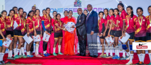 The winning captain Aroshika Inoshi receiving the coveted “Lionesses Trophy”