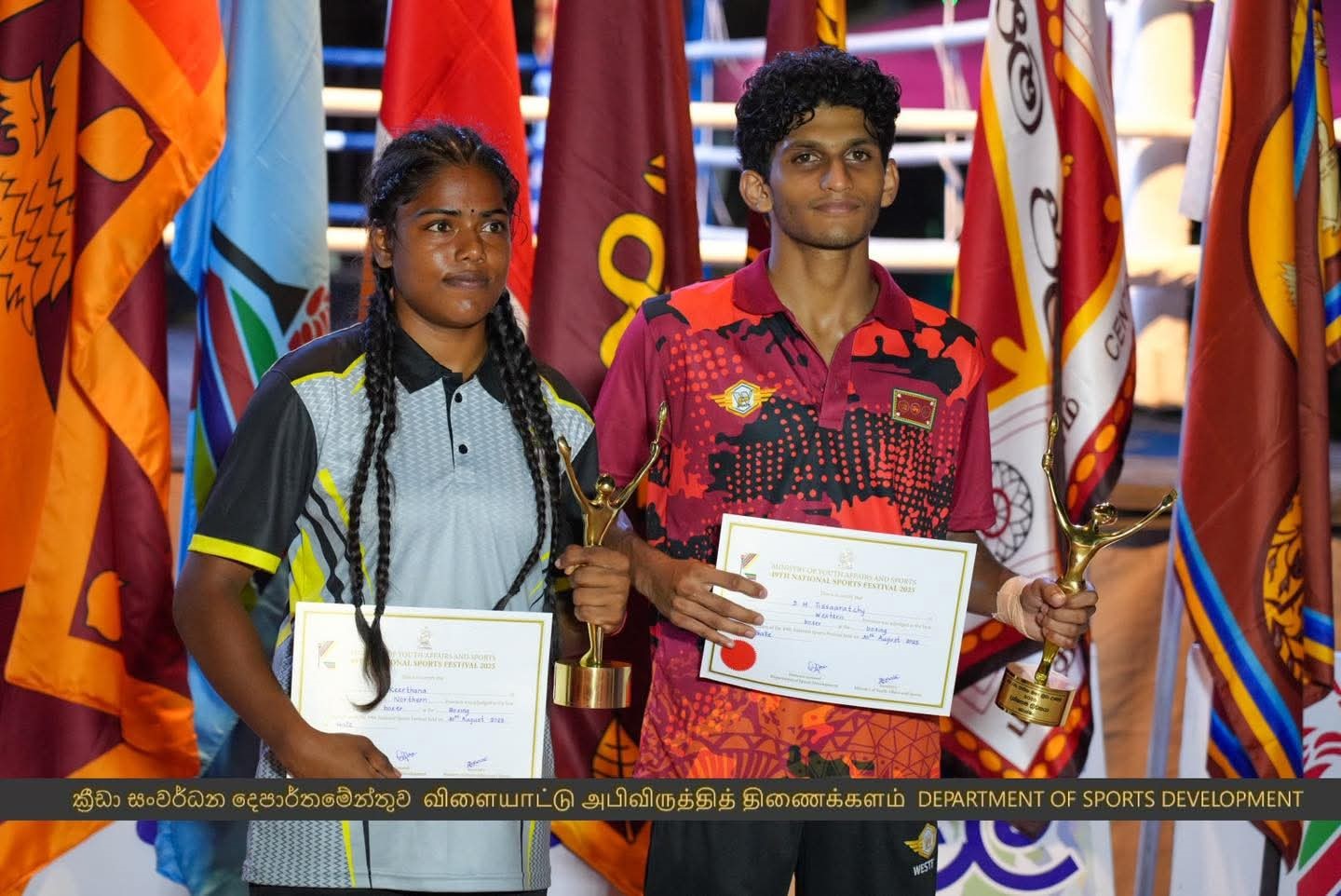 After some shocking battles, Western Province clinched the overall championship of the 49th National Sports Festival by stamping their supremacy and authority for yet another year (with a medal bag of 8 golds, 2 silvers and 8 bronzes). The pugilists from Southern and Central Provinces chased them closely and won 1st and 2nd runners-up titles, respectively.