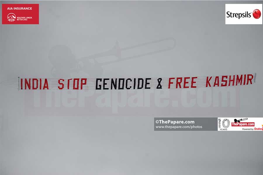 ශ්රී ලංකාව හා ඉන්දියාව අතර ඊයේ (6) පැවැත්වුණු ලෝක කුසලාන ක්රිකට් තරගය අතරතුර “#Justice for Kashmir” හා “India stop genocide & free Kashmir” යන වැකි රැගත් බැනර් සහිත ගුවන් යානා හෙඩින්ග්ලි ක්රීඩා පිටියට ඉහළින් ගමන් කළ බව ජාත්යන්තර මාධ්ය වාර්තා කර තිබුණි.