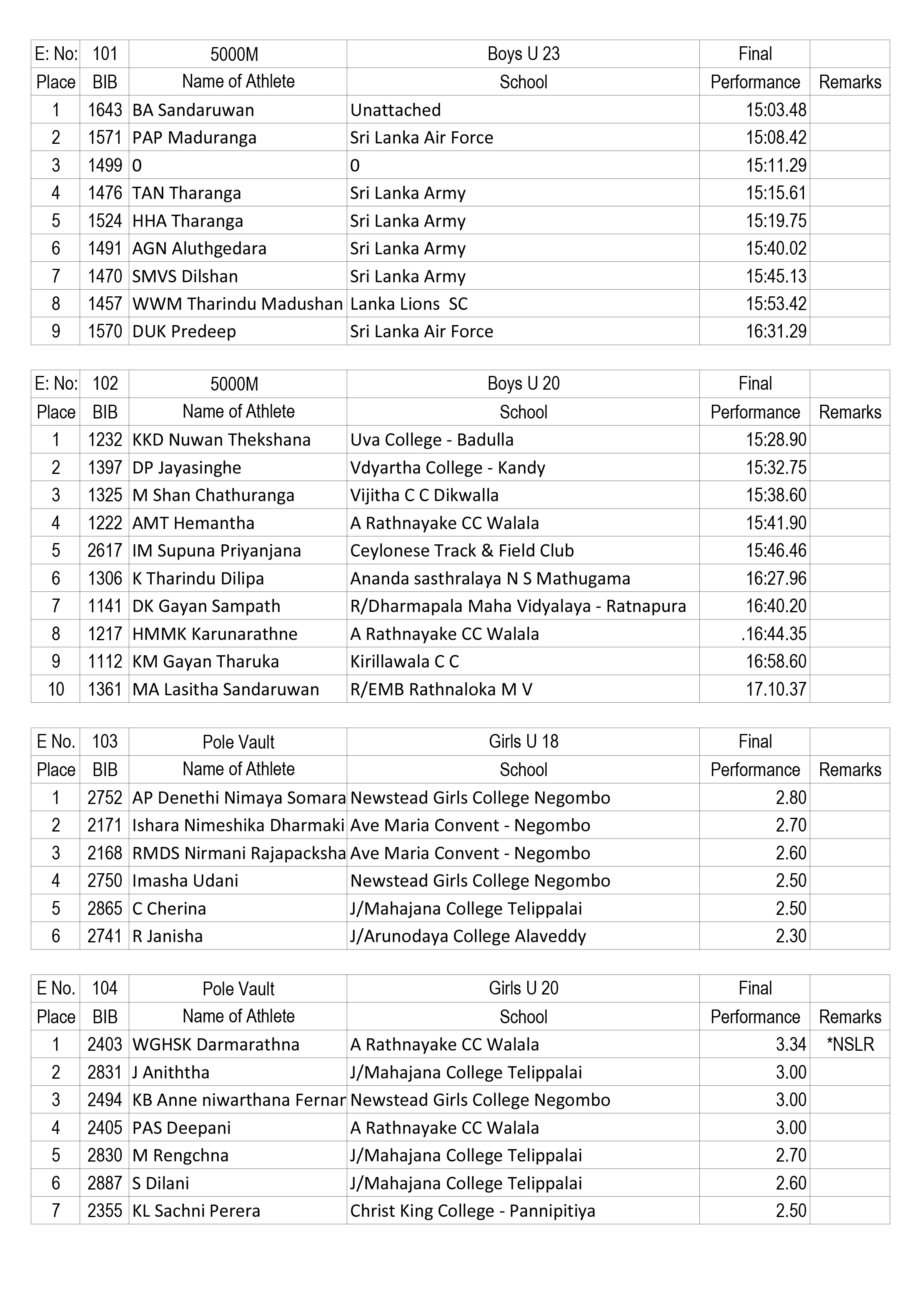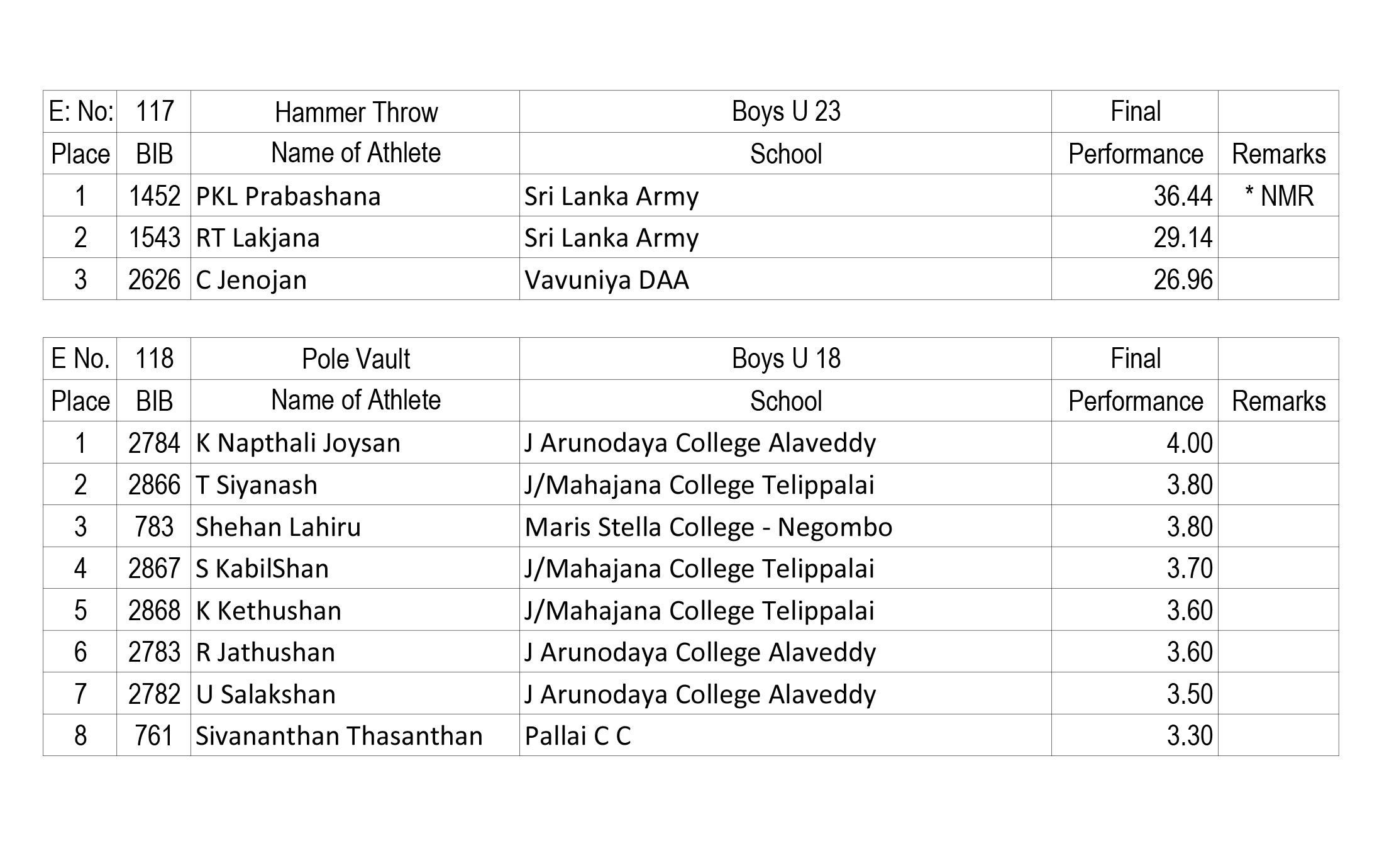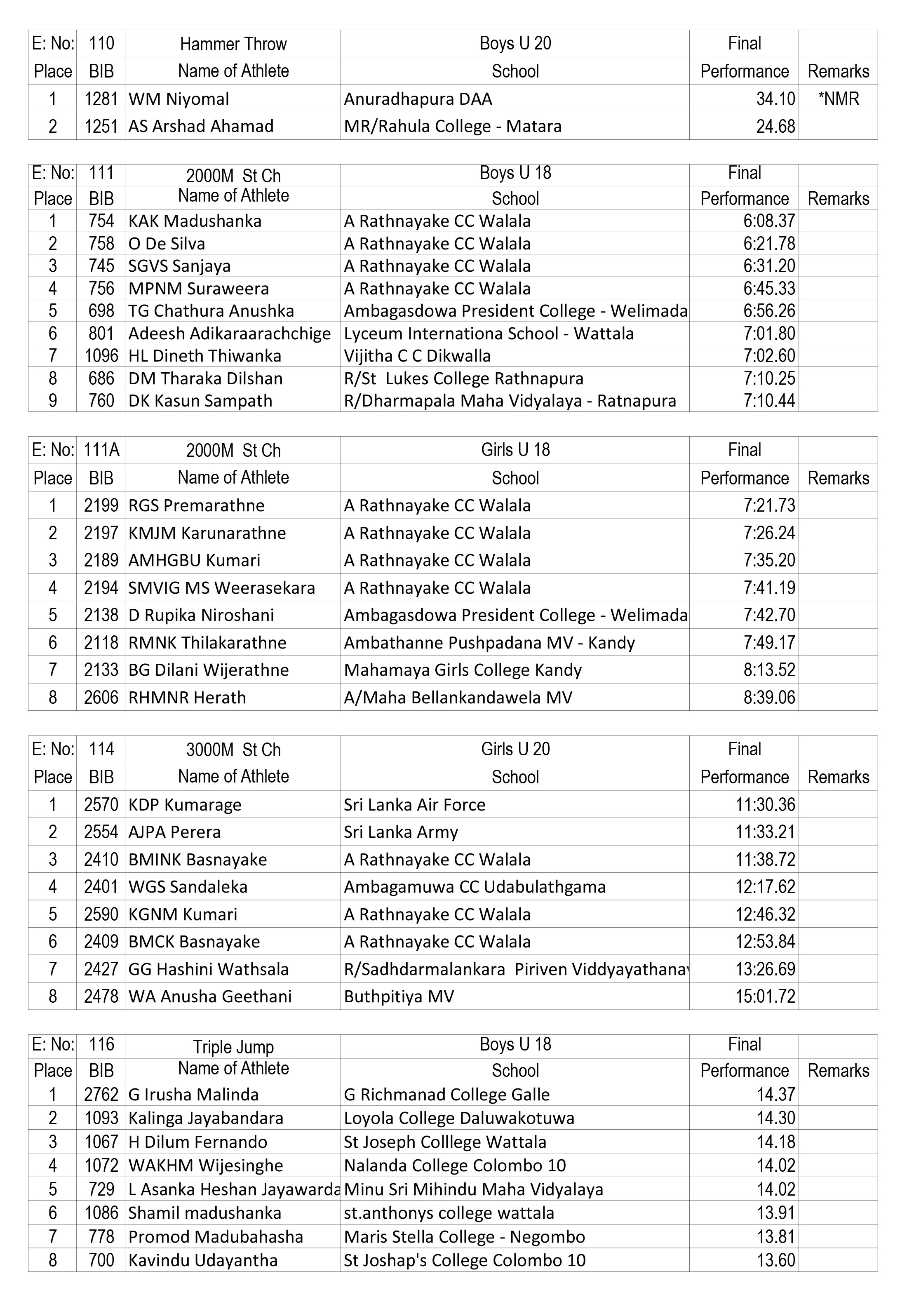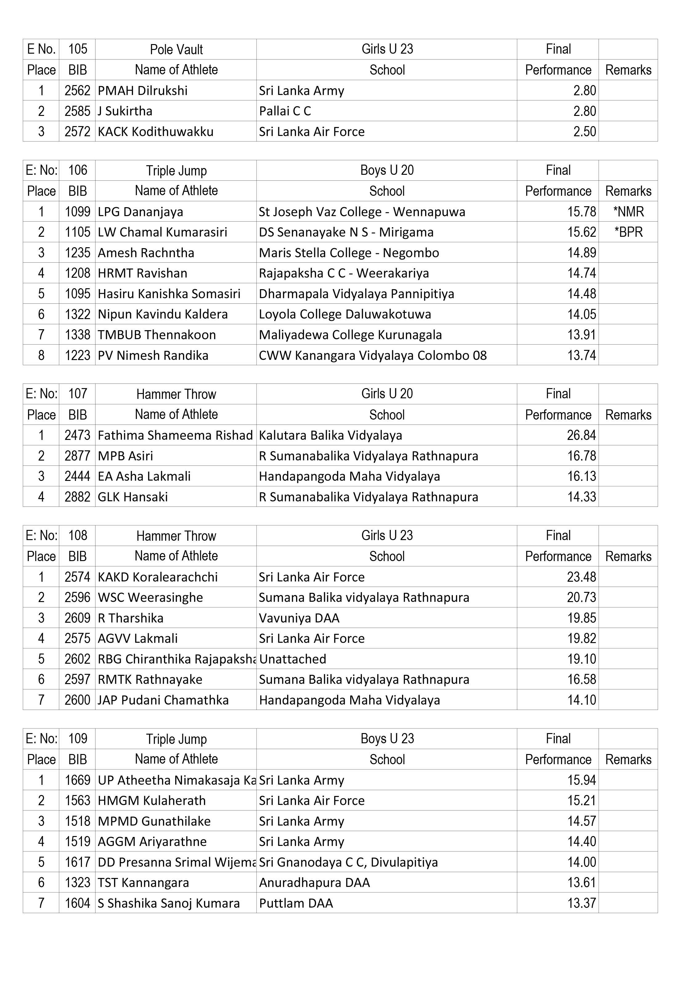 The event got off to a dazzling start with four meet records, including a Sri Lanka record in the Girls U20 Pole vault event, tumbling on Day 1. WGHSK Dharmaratna from A Rathnayaka Central College, Walala achieved a final performance of 3.34M in the pole vault event giving her the honour of becoming the first national record breaker in this years’ event, The three new meet records were set by LPG Dhananjaya (St Joseph Vaz College – Wennapuwa) who achieved 15.78M in U20 Boys triple jump, W.M Niyomal (Anuradhapura DAA) who achieved 34.10M in the Boys U20 Hammer throw and PKL Prabashana (Sri Lanka Army) who achieved 36.44M in the Boys U23 Hammer throw event.