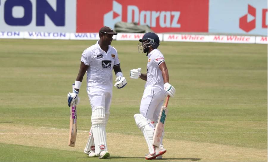 இதேவேளை முதல் நாள் ஆட்டநிறைவில் ஆட்டமிழக்காது களத்தில் நிற்கும் அஞ்சலோ மெதிவ்ஸ் 114 ஓட்டங்களுடன் காணப்பட, தினேஷ் சந்திமால் 34 ஓட்டங்களை எடுத்திருப்பது குறிப்பிடத்தக்கது.