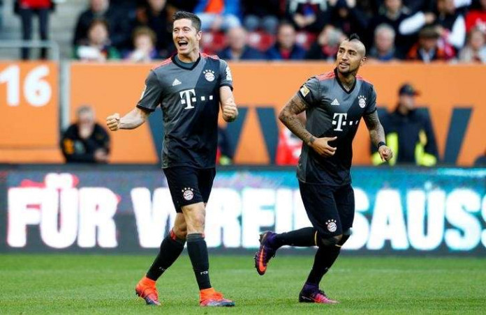 Robert Lewandowski scored twice to help Bundesliga leaders Bayern Munich win 3-1 at Augsburg on Saturday, three days after beating the same opponents by the same score in the German Cup.