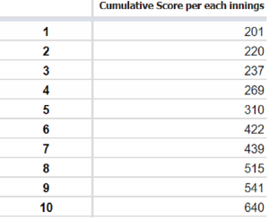 සෑම ඉනිමකට සමානව ලකුණු රැස්කිරීමේ අනුපිළිවෙළ සැකසීම ලෙහෙසි පහසු කාර්යයක් නොවේ. මෙය වර්තමානයේ ක්රිකට් හි දත්ත සැකසීමට සමත් “Statsguru” වැනි දත්ත පුවරු තුලින් ද ලබා ගැනීමට අපහසු ක්රමයකි. කාලය ගතවූවත් මේ අනුපිළිවෙළ සැකසිය හැකියි. මෙයින් ශ්රී ලංකා පිතිකරුවන් සෑම ඉනිමකට පසු රැස්කර ඇති මුළු ලකුණු ප්රමාණය ගණනය කළ හැකි අතර එක් එක් ඉනිම් සඳහා අවම ඉනිම් ප්රමාණයක් වැය කළ ක්රීඩකයා සෙවීම ඉතාමත් පහසුයි.