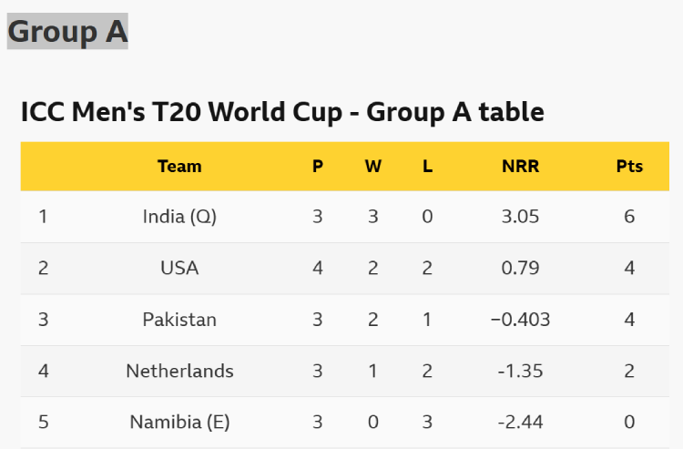 Defending champions India sealed their place in the Super 8s with a comfortable 61-run win over rivals Pakistan. Pakistan slipped to third with that defeat, with their net run-rate taking a heavy hit. However, a win in their final game against Namibia on Wednesday would see them progress.