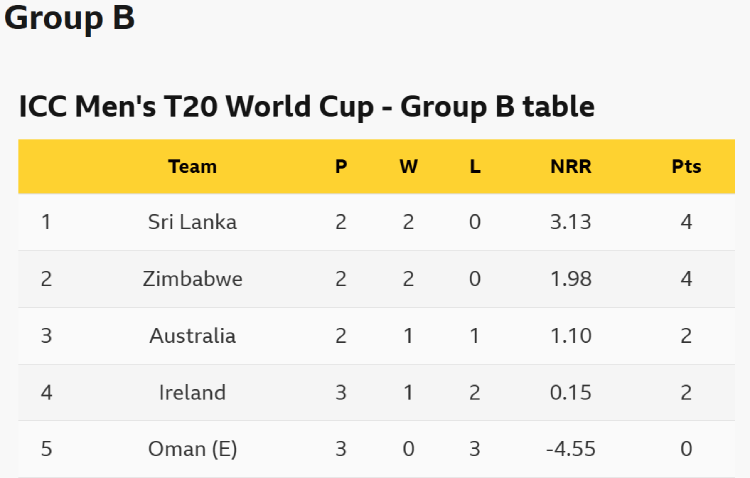 Remaining games: Australia v Sri Lanka (16 Feb, 7.00 PM), Ireland v Zimbabwe (17 Feb 3.00 PM), Sri Lanka v Zimbabwe (19 Feb, 3.00 PM), Australia v Oman (20 Feb, 7.00 PM)