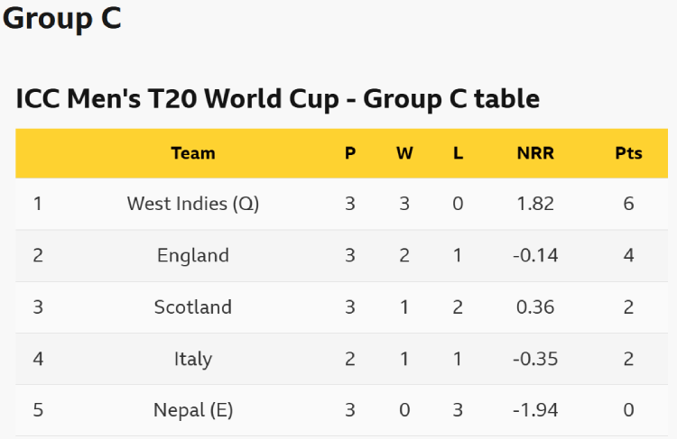 Italy must beat England but could lose to West Indies and then net run-rate would decide who progresses. Two wins would see them through, as would a win against England and a washed-out game against West Indies.
